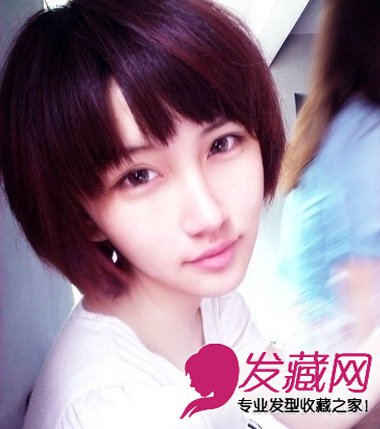酒红色的齐刘海短发,好漂亮好清新,红色系的染发颜色,把脸颊映得白皙又圆润,水润的双眼,齐刘海的烘托下,散出学生mm的可爱灵气。