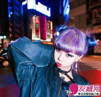 嘟起的红唇俏皮迷人,紫色与蓝色的渐染,张扬个性,微微内卷的齐刘海巧妙打造出精致小脸,头顶蓝色染发卷成两个小丸子,非常可爱。