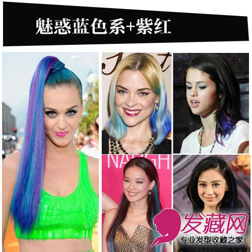 和紫色一样,蓝色系也已一跃成为各界名流的热门发色。你看凯蒂佩里那一头蓝色挑染马尾,展现出的是一种酷感十足的超自然之美,浑身上下透出一股炫目的霸气。而向来以一头黑发出场的舒淇和AngelaBaby也在用蓝色挑染征服了大众的眼睛,蓝色系就是这样,虽有先锋之风格,但仍不乏女人的性感,搭配些许紫红,更有另一种美。