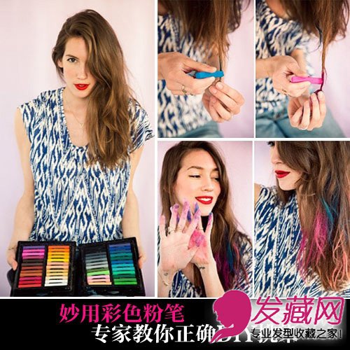 Step2:用粉笔潮湿的那一端从上往下涂抹在你的发梢(建议只往一个方向涂抹,以免伤害头发)直到颜色完全附着在你的头发上。
