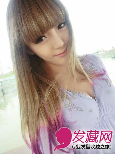 夏季的色彩主打绝对是以,糖果色或是类似的彩色亮色为王道。这一款挑染的染发颜色绝对非常的时尚,亚麻金色为主要发色,在发尾染上紫色的挑染,甜美又时尚。