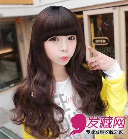 韩国女生的发型永远跟随时尚潮流,甜美的女生,一头柔顺的齐刘海卷发,染上纯美的巧克力发色,清新怡人。