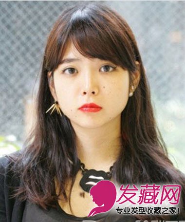 前额刘海修剪至齐眉位置,微微偏分可以令深色发看起来不那么死板。长发的发尾部分卷烫出适量卷花,打造改良版梨花头造型。发卷无需太过明显,起到加厚发量效果即可。