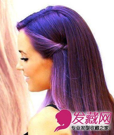 顺直的直发发型在中分发在侧边编发丰富发型,令直发造型也能更显现出气质美感,加上深紫色染发造型后更是迷人。