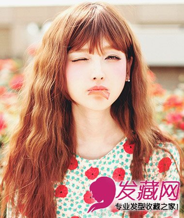 很少女系的一款甜美卷发烫发,发丝披散两肩,棕色的染发最是显白嫩,清新的韩式齐刘海发型修饰脸型,最显脸小。