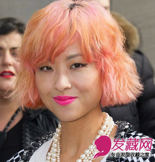 徐濠萦:粉橘色混染短发,黄、粉、橘色混合挑染,配上徐濠萦玫粉色亮唇,整体感觉时髦亮眼,潮范儿十足。