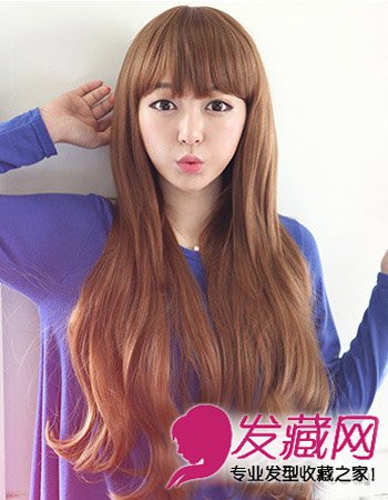 飘逸的长发随意的搭在肩膀处,齐刘海的设计有很好的修饰脸型的作用,在发尾处进行了卷烫的处理使整体造型更加有活力。