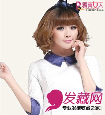 具有韩式甜美气质的一款短烫发发型,很适合软妹纸一族。蓬蓬的小卷发搭在脸颊,配上萌萌的齐刘海瘦脸效果百分百。俏皮的烫发搭配时尚的染发发色,将整个人的气质凸显地更加活泼生动,蝴蝶结发饰与服装相映衬,看起来更加可爱。