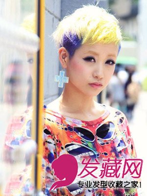 很帅气的一款女生短寸,精致有个性,亮黄色与深紫色形成色彩的碰撞。斜刘海短发更显帅气与编犀利。十中的耀眼范。
