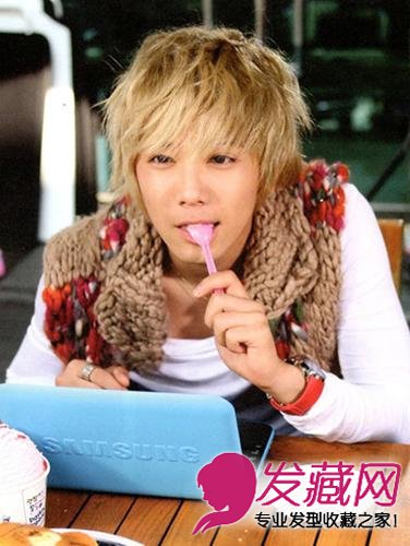 金黄色的染发,有点张扬和不羁,盖住部分眼睛,同时也遮挡了有点高的颚骨,脸型显得更加的圆润年轻,塑造了一个非常有个性的花美男形象。