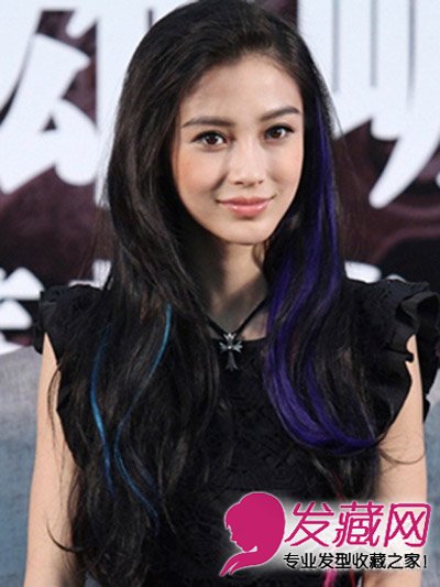 玫红+靛蓝+紫色的三色挑染,虽然颜色略多且跳跃,但三色没有夹杂在一起,个性而不浮夸庸俗,你喜欢angelababy的这个造型吗?