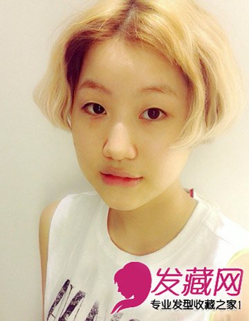 中分短发发型,略微有点韩式蛋卷头的造型,显出可爱又有气质一点,而亚麻色的发色与肤色融为一体,亮眼十分。