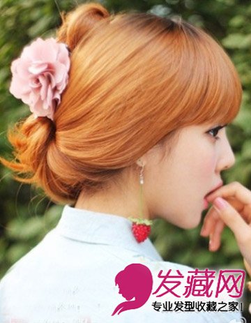 一款分唯美的气质盘发发型,简单的低扎盘发然后点缀上花朵,凸显出一种温婉的气质。特别是栗色的发色衬肤白的同时也凸显出绝佳 的气质。