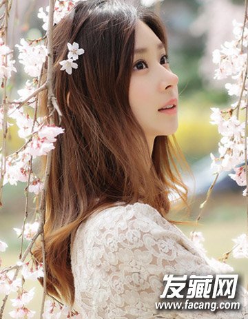 清新甜美的一款气质中长发发型, 高挺的鼻梁加上精致的五官勾勒出无比的优雅与时尚 感来, 点缀上抢眼的黄棕色发色自然显气质。
