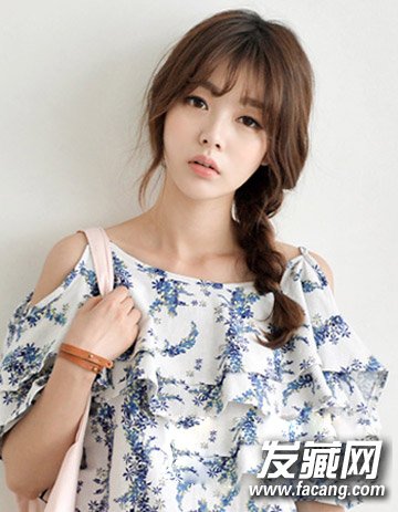 精致的鹅蛋脸加上小巧的侧马尾编发显露出无比的休闲时尚来,空气刘海打造出别致的气质与时尚感来,造型甜美显时尚。