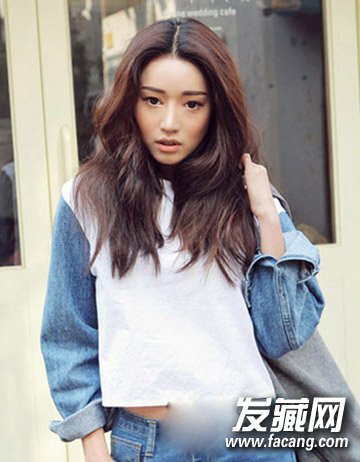 略显个性风式的一款时尚女生棕色染发发型,同样利用的是时尚的中分造型设计,而与这种清新自然的中长发相搭,微显蓬松的大卷发烫发设计修颜的同时更添优雅妩媚风。