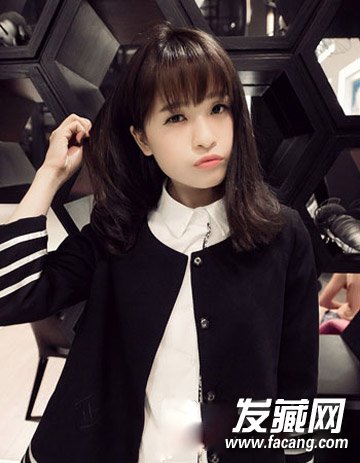 甜美的齐刘海造型设计再配合清新低调的暗栗色染发可是最显女生的清纯可爱感了,而时尚的发梢烫发设计更添十足活泼感。
