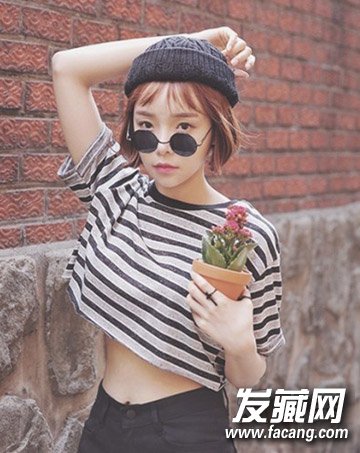 一款俏丽短发发型,对于喜欢短发的妹子来说,这样一款也是很不错的,不到下巴的长度简单好打理,超短空气刘海甜美可爱,细碎的剪裁露出小脸更显呆萌,红棕色的染发显白更时尚。