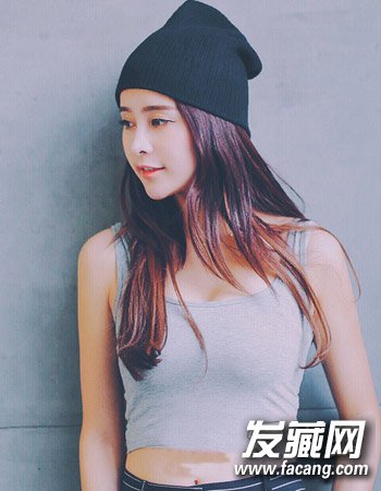 清爽的中分无刘海造型设计将韩国女生精致的五官与娇小的脸型完美的呈现出来,再搭配这种清新飘逸的长直发与深色系的紫色与棕红色之间的挑染造型设计,潮流中更添清新女神范儿。