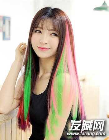 清新灵动感的空气感刘海造型可是最显女生十足的甜美可爱风的了,再搭配这种及腰形式的长直发更添清新感,而挑染上的炫丽的红色与青色的发束更添十足潮流气质感。