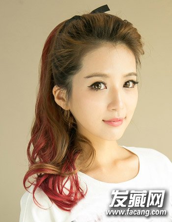 一款青春活力感上女生好看的挑染发型图片,以清爽的露额扎发为主来衬托出女生精致的五官造型,再搭配活力高马尾扎发与发梢深红色的挑染造型同样潮流感十足。