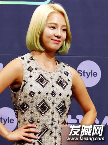 韩系甜美荧光色短发发型,利用内蓬的效果让发丝展现出极为顺滑莹亮的质感,很适合知性OL的一款清爽亮色系染发颜色。