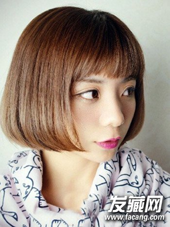 轻熟女最爱的一款瘦脸短发发型,齐刘海修颜瘦脸,棕色染发搭配内蓬的短发设计,很有甜美气质。