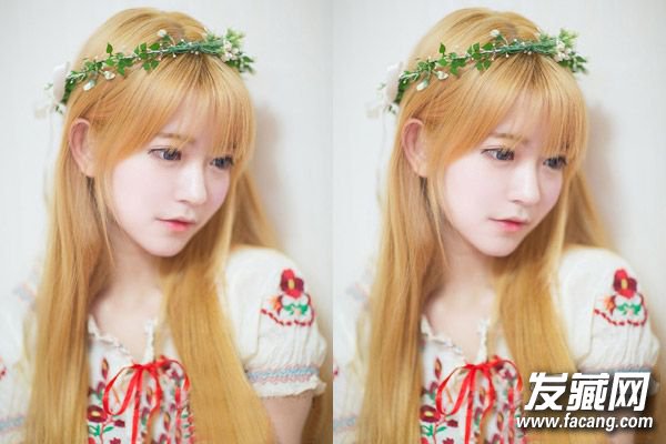 小脸女生适合什么发型呢?这款黄色系的披肩长直发发型,搭配齐刘海下的白皙脸蛋,绿色系的花环,搭配白皙的精致小脸,清纯时尚超迷人。