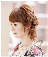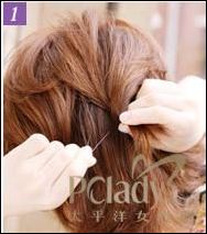步骤1、用棒将整体的发梢向外打成大大的发卷,然后将后面头顶的头发拢起来,用发夹暂时固定住。拢的时候可以一边拧成股一边地拢起。