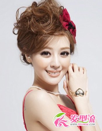 将下半区秀发挽在脑后,余留出的头顶发丝利用造型产品制造出凌乱感,乱而有序的平铺在头顶。抢眼的蝴蝶结点缀在发型上,塑造出甜美的小女人气息。搭配红色系礼服,勾勒出曼妙的身材曲线,珍珠项链在性感的锁骨间极具诱惑力。