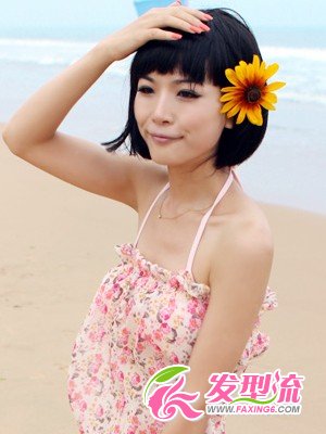 黑色的发丝呈现出女生清纯的气质,不规则的锯齿刘海更具独特魅力。发尾恰到好处的短至颈部,搭配花色保守型泳衣显露出美丽的颈部线条和性感的锁骨。利用花朵装饰点缀发型,更加有游玩的度假风哦!