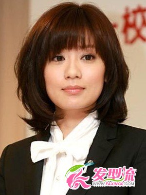 在波波头发型的基础上将发尾烫卷,几缕发梢的外翘与内卷相互交错,包裹脸型显现出五官。丰盈蓬松的烫发让造型看上去更加饱满,齐刘海又有减龄的效果,搭配黑色职业装扮,显现出女性的知性美。
