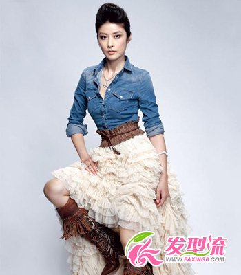 自然乌黑的长发盘成蓬松高耸效果,带着强烈的视觉冲击,彰显高贵大方的名媛气质。牛仔衬衣+卡其色蓬蓬拖裙,非常有韩流范。