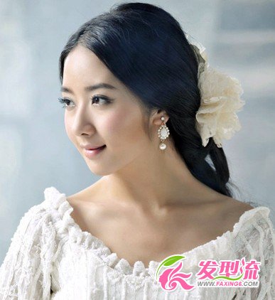 中分的流海,把头发全部拢到脑后盘起低低的发鬓,用蕾丝花饰别住,纯黑的发丝美丽逼人,更显温婉气质。