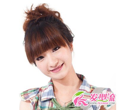齐刘海可爱扎发盘发,圆圆的鹅蛋脸脸颊,配上齐刘海能简单打造出青春的可爱形象,后面的低发髻束扎发,随便抓出一些蓬松感发丝在发髻表面,更时尚有活力。