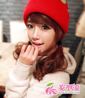 利用双马尾造型来打造出女生的可爱度,是最佳方法。这款扎发简单又易学,还能让女生散发出青春活力的气息。将刘海拨开出倾斜弧度,借此修饰脸型。搭配红色的针织帽正好迎合新年新气象,又能增添一抹色彩惊喜感。