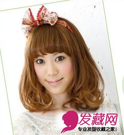乖乖女微卷发型,半圆的刘海设计很好的修饰了女生脸型,披散着一头浪漫感的长卷发,配搭粉色的蝴蝶结发饰甜美气质倍显。