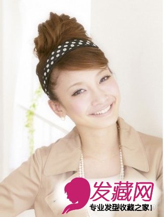 高扎的丸子头盘发,加入圆点的发箍,具有时尚复古公主风。