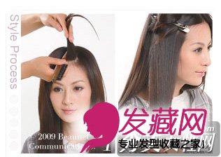 step.2 将整体头发分为左、右、后三大发区,用直板夹从发根开始,向发梢进行夹烫。打造成流畅的直线发丝。