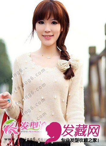麻花辫的打造演绎着风情万种,侧扎的麻花辫更是风情迷人。利用蝴蝶结的发饰捆绑马尾,甜美萝莉范让人美不胜收,齐刘海的发型打造,凸显出一双清澈的双眸,明亮有神。