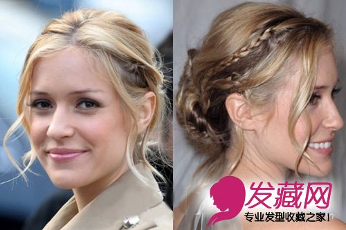 Kristin Cavallari的发型很容易,人人都可以做,在左右两侧各编两个细股麻花,到中间跟其余的头发转成盘发。