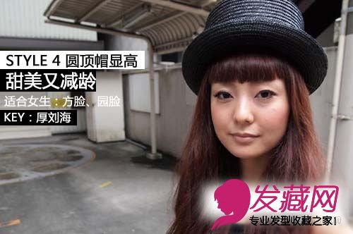 从从容容显高,这是圆顶帽的隐增高绝技。厚刘海尤其适合圆顶帽,蓬松的棕色、酒红色长卷发,不仅能帮忙瘦脸,还能减龄显白。斜刘海也是可以的,但温柔指数高于显高指数,并且对于头小的女生来说,厚厚的头发才能HOLD住帽子哦。