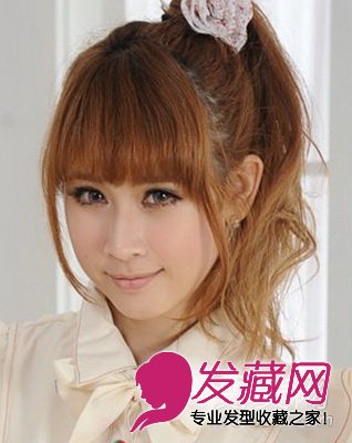 齐刘海发型,起到了很好的减龄效果,清爽时尚的马尾发型,搭配齐刘海的发型设计,洋溢着青春活力的动感气息,也是2012夏季流行发型之一,融入棕栗色的染发颜色,是一款时尚百搭发型。
