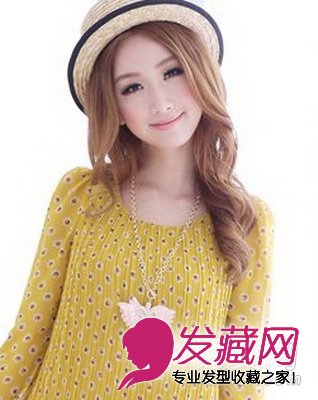 中分刘海发型设计让卷发发型更显时尚大气,中长发呈大波浪卷发的造型,生动又不失女生可爱的气息,搭配一款遮阳帽,尽显青春俏皮味道。