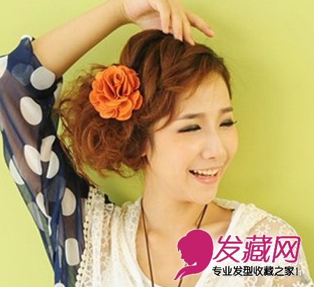 这款侧发髻盘发与卷发的设计,让发型优雅自然,也制造出空气感十足的效果,从而修饰了女生的脸型,再搭配橘红色假花,彰显女生的甜美。而麻花辫刘海编发的效果,使整个盘发发型都极具时尚气息。