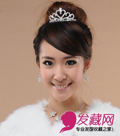 这款新娘发型图片,散发出公主般的高贵迷人气质,虽是一个简单的花苞头造型,搭配上皇冠发饰,在漂亮新娘的演绎下显得异常的漂亮,斜刘海的新娘发型设计,更展现出新娘的清新女人气质,搭配皮草披肩,很是高贵优雅。