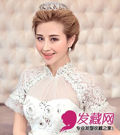 没有发髻的耀眼突出,利用夹子将一缕一缕的发丝层叠固定,打造出盘发的效果,花样的魅力实在是无法抵挡,无刘海发型的新娘发型,展现高贵与优雅的新娘气质,搭配带有点复古风的婚纱,整个新娘造型很有耳目一新的感觉。