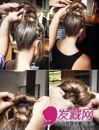 用手指夹住那股头发,顺时针地将它以一定的角度盘绕在底部绑皮筋处,再沿着底部上侧将它展开,揪住发尾处放到前面编好的辫子下面。