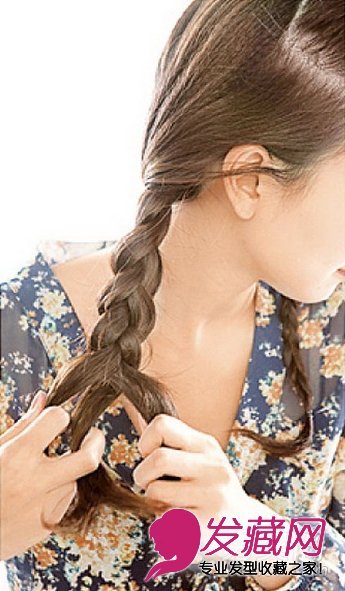 其余头发全部往右侧编成一条三股辫,用橡皮筋固定。