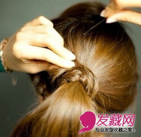 步骤四、将编好的三股辫往马尾里绕圈,再用发夹固定。